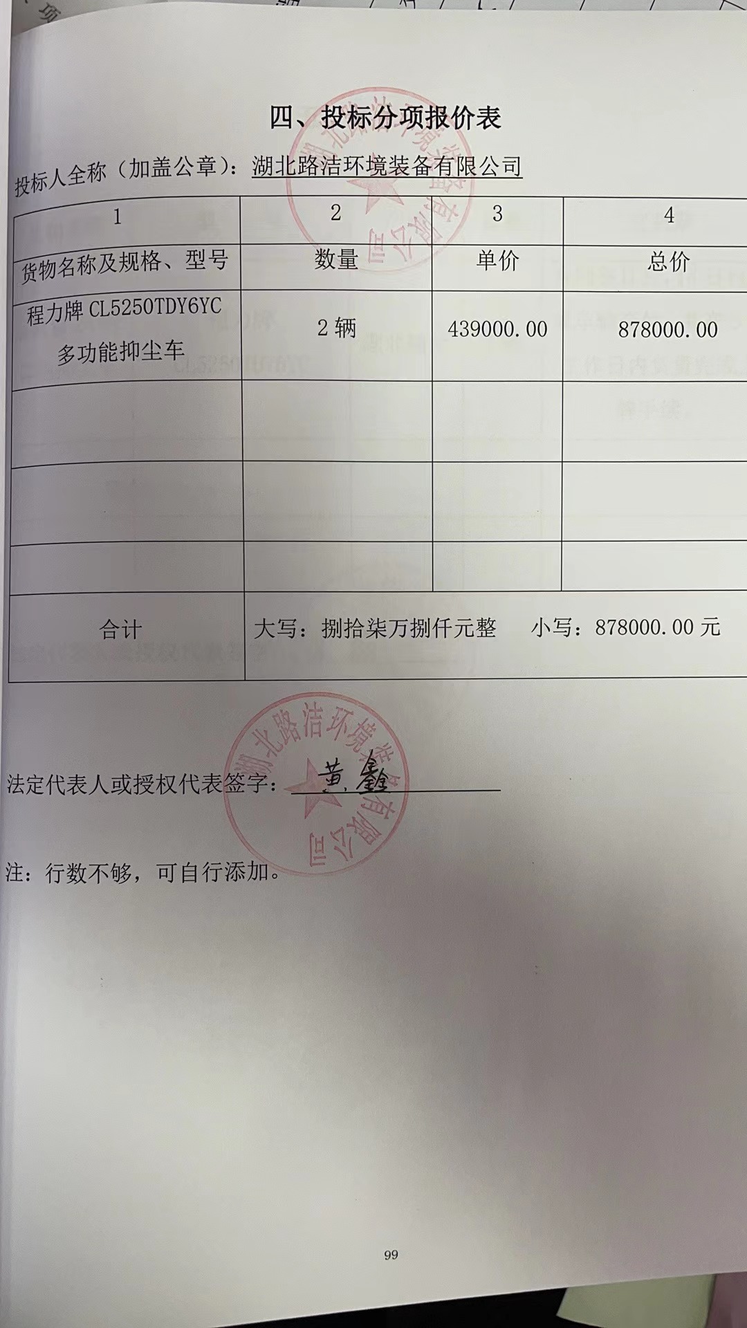 一、項目編號:RTCGDL-20231010號 二、項目名稱(chēng):購置總質(zhì)量25噸霧炮抑塵車(chē)項目(二次) 三、中標信息 供應商名稱(chēng):湖北路潔環(huán)境裝備有限公司 供應商地址:隨州市經(jīng)濟技術(shù)開(kāi)發(fā)區十里鋪村3幢1層號 中標金額:人民幣捌拾柒萬(wàn)捌仟圓整(¥878000元) 四、主要標的信息 貨物類(lèi) | 名稱(chēng):購置總質(zhì)量25噸霧炮抑塵車(chē)項目(二次) 品牌:詳見(jiàn)附件 數量:詳見(jiàn)附件 規格及型號:詳見(jiàn)附件 單價(jià):詳見(jiàn)附件 |